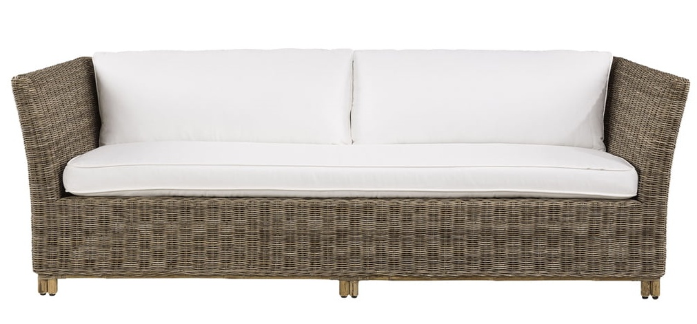 Luonnonvalkoisilla istuintyynyillä sekä kaarevilla käsinojilla. Sohva soveltuu erinomaisesti vaikkapa katetulle terassille. Aito rottinki on suojattava säältä.