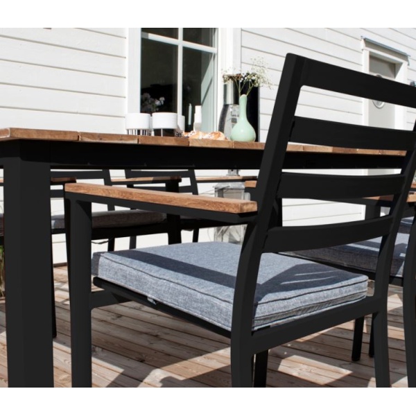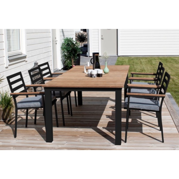 Käsinojissa upeat puiset yksityiskohdat. Yhdistä ulkotilasi ruokapöytään ja luo samalla viehätystä terassisi sisustukseen. Alumiinista ja ruostumattomasta teräksestä valmistetut ulkokalusteet tulee puhdistaa säännöllisesti vedellä ja miedolla saippualla.