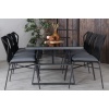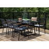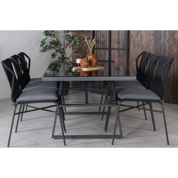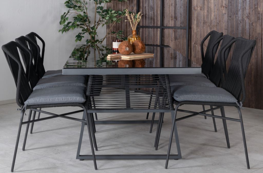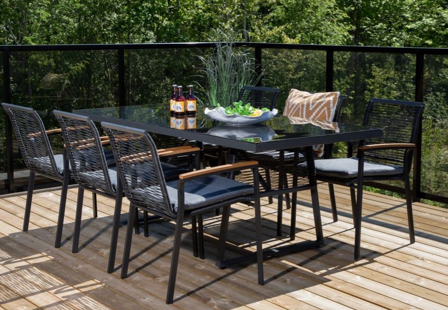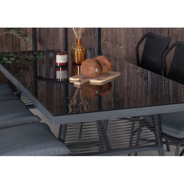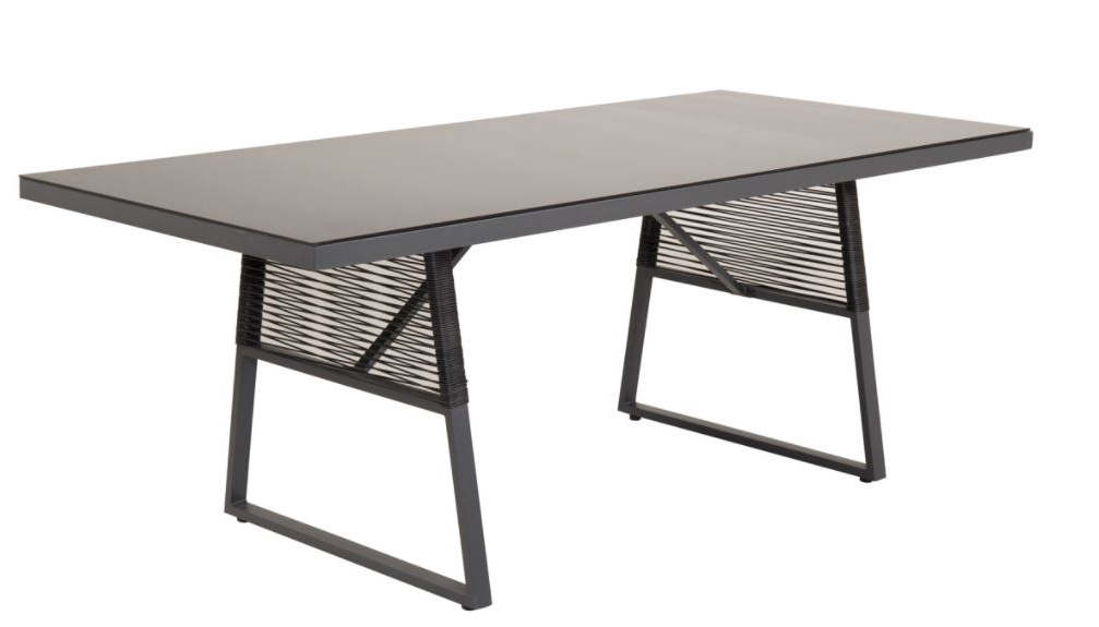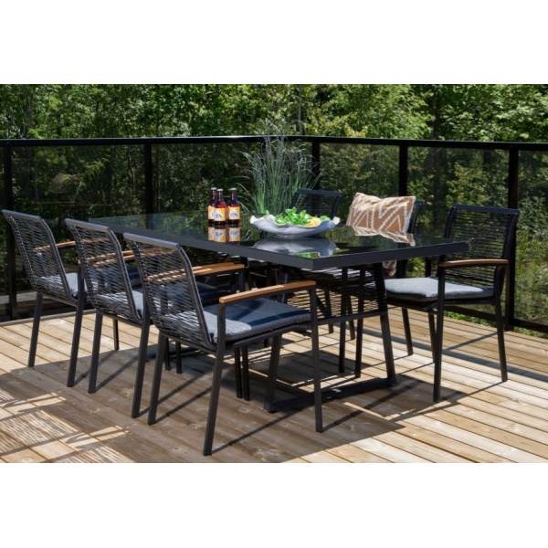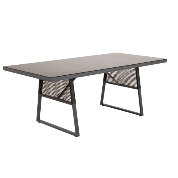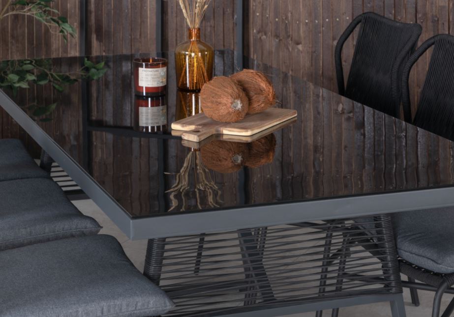 Pöydän kansi on tummaa lasia ja sen rungossa on köysiyksityiskohtia, jotka antavat pöydälle tyylikkään ilmeen. Nauti kesäisistä illallisista yhdessä perheen tai ystävien kanssa! Alumiinista ja ruostumattomasta teräksestä valmistetut ulkokalusteet tulee puhdistaa säännöllisesti vedellä ja miedolla saippualla.