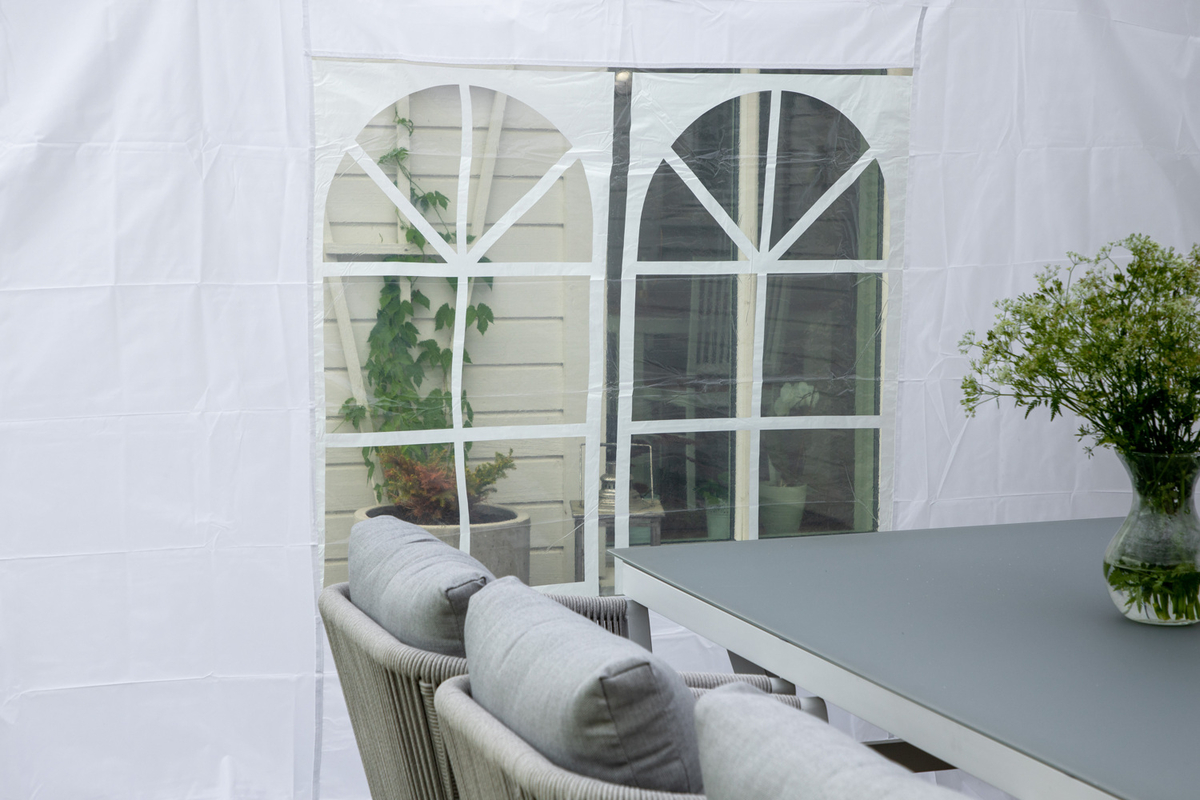 Kangas on likaa ja vettä hylkivä ja se voidaan puhdistaa hellävaraisella käsinpesulla. Muista, että kangaskatto ja seinät eivät ole tarkoitettu kestämään äärimmäisiä sääolosuhteita. Suositeltavaa aina tuoda paviljonki sisään kauden jälkeen sen käyttöiän pidentämiseksi. Toimitus osissa.