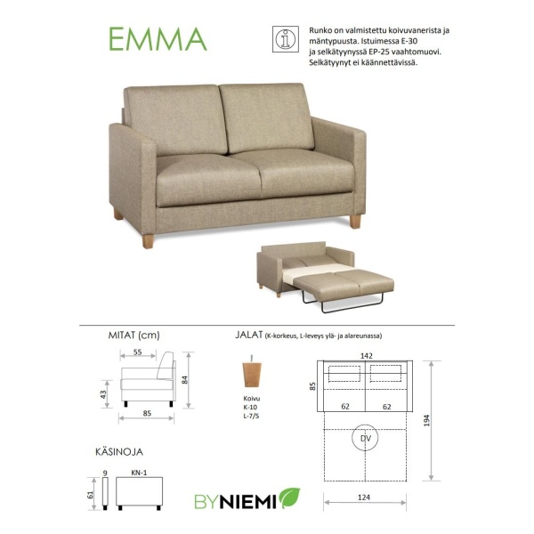 Emma Vuodesohva on täydellinen ratkaisu pieneen olohuoneeseen, vierashuoneeseen tai vaikkapa opiskelija-asuntoon. Sen kompakti koko tarjoaa silti mukavan istumapaikan kahdelle henkilölle ja tarvittaessa se muuntautuu kätevästi vuoteeksi. Runko on kestävää massiivipuuta sekä vaneria ja istuintuntuma on jämäkkä.
