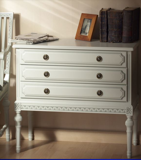 Kotimainen Kustavilainen lipasto kolmella laatikolla – klassista tyyliä ja käytännöllisyyttä