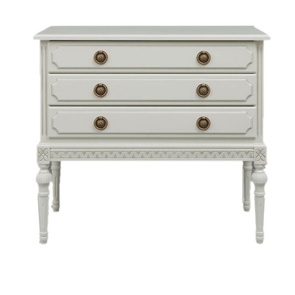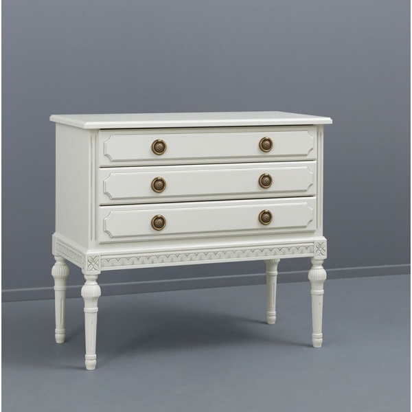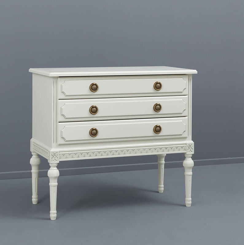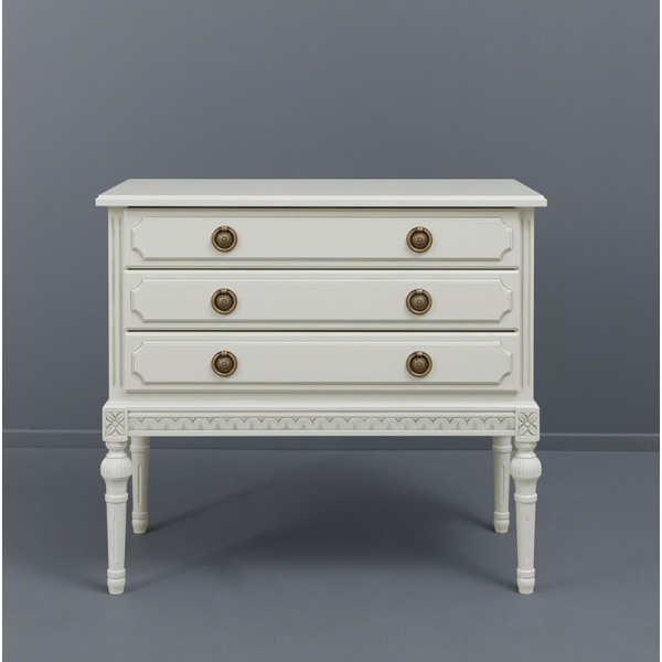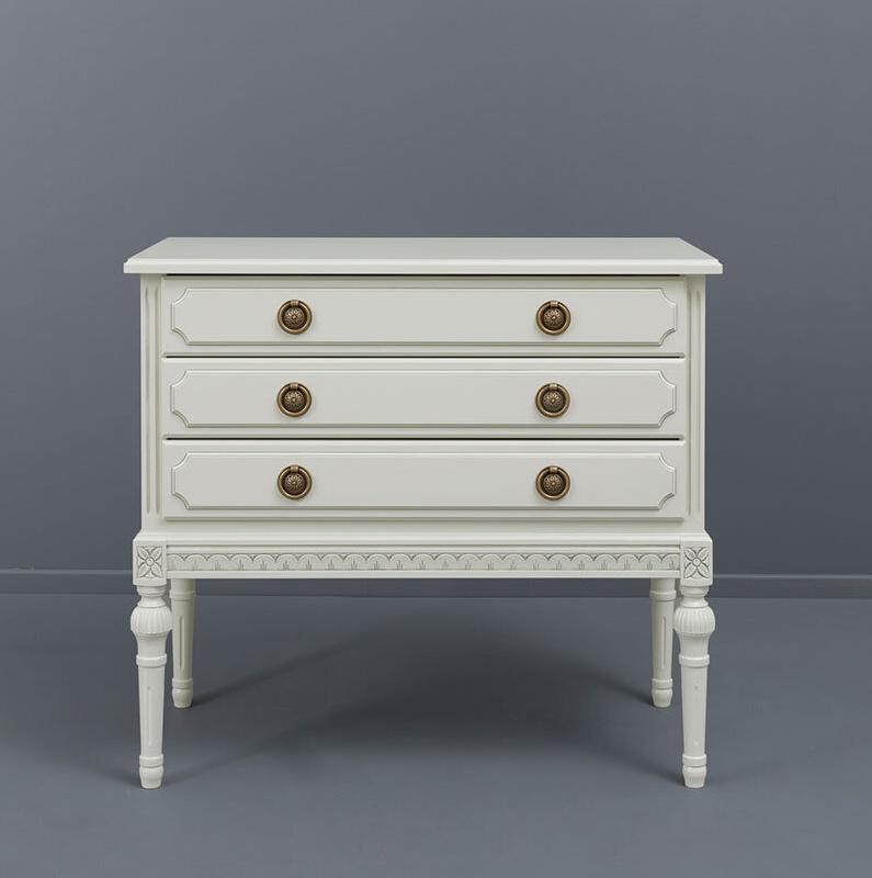Kotimainen Kustavilainen lipasto kolmella laatikolla yhdistää ajattoman muotoilun ja laadukkaan käsityön, tarjoten runsaasti säilytystilaa tyylillä. Saatavana useissa väreissä sekä käsin maalatulla kullan- tai harmaanvärisellä patinoinnilla – toimitetaan valmiiksi koottuna.