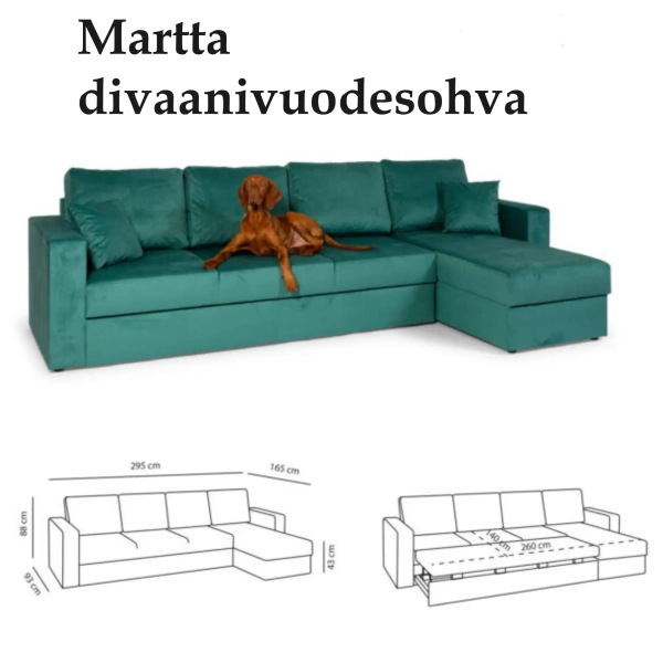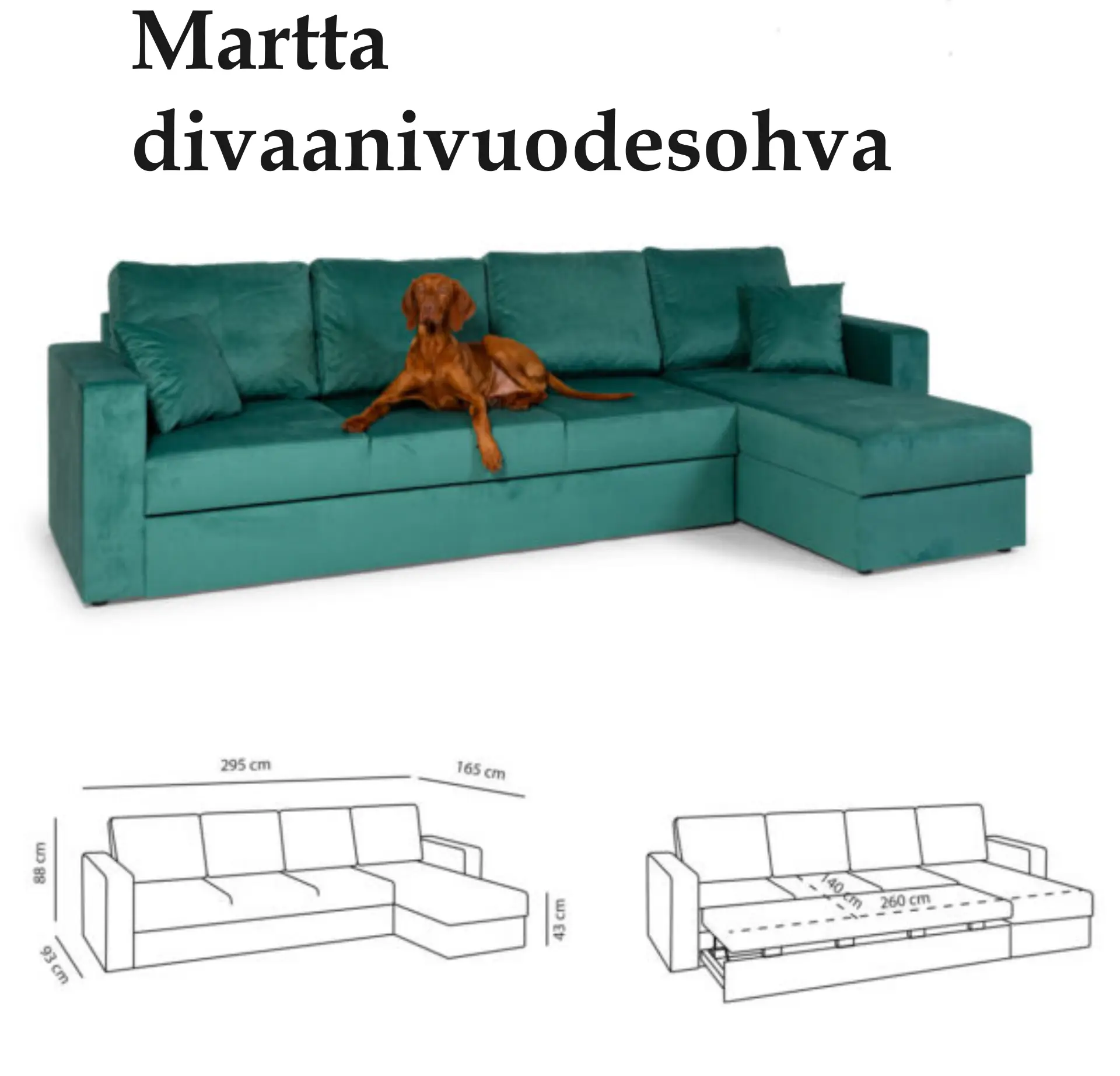 Martta vuodesohva vuodevaatelaatikolla omaa kauniin muotoilun, joka sopii moniin eri sisustuksiin. Martta sohva tarjoaa sekä mukavuutta että käytännöllisyyttä. Kätevä mekanismi mahdollistaa sohvan muuntamisen vuoteeksi vetämällä etuosaa. Runko on laadukasta massiivipuuta, kalustelevyä sekä vaneria, ja istuimissa on laadukas zig-zag jousitus. Sohvan divaaniosan kätisyys on valittavissa ja sohvan takaosa on viimeistelty, mikä mahdollistaa sohvan sijoittamisen myös keskelle huonetta. Vuodekoko avattuna 140×260 cm.  Viimeistele kokonaisuus tilaamalla sijauspatja tai tyylikkäät koristetyynyt.