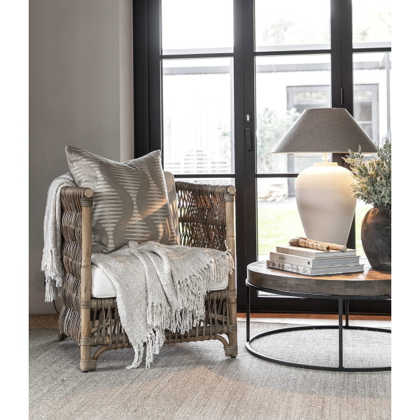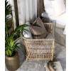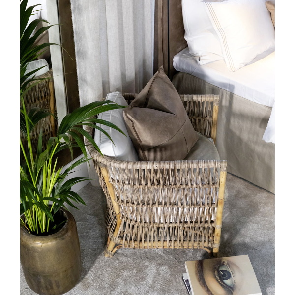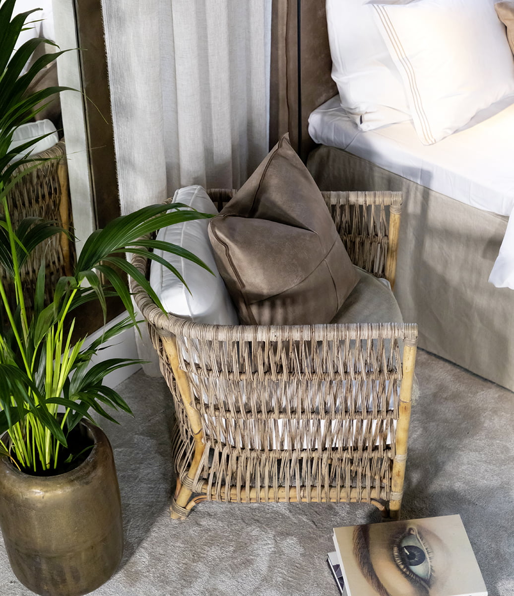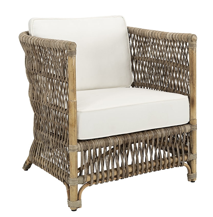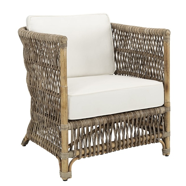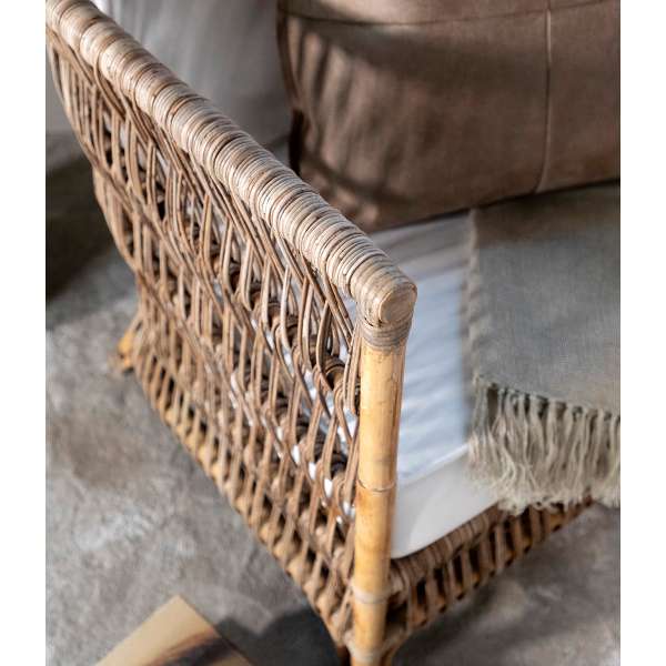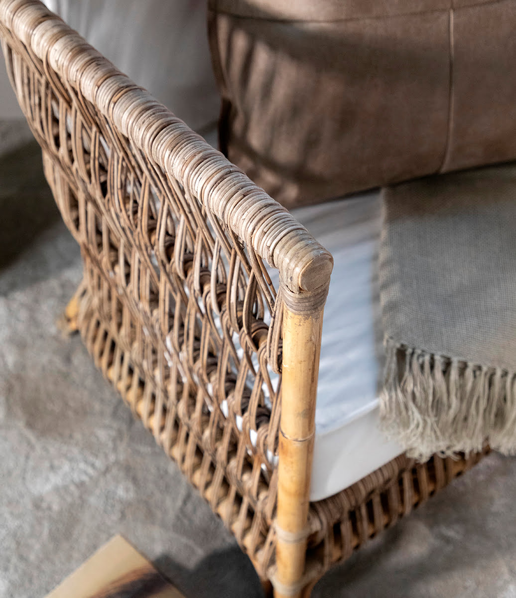 Kaunis rottinkinen tuoli luonnonvalkoisilla istuintyynyillä sekä korkeilla käsinojilla. Tuoli soveltuu erinomaisesti vaikkapa katetulle terassille. Aito rottinki on suojattava säältä.