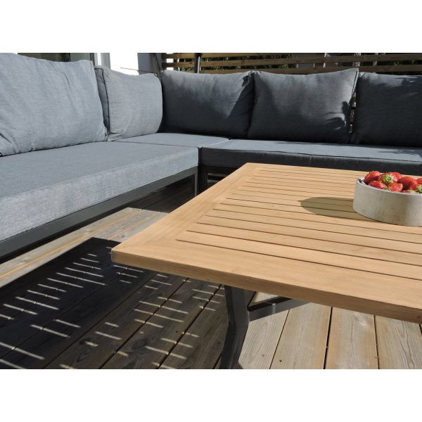 • Kestävä materiaali: Jauhemaalattu metallirunko ja sertifioitu tiikkipuu takaavat pitkäikäisyyden ja vähäisen huollon tarpeen.